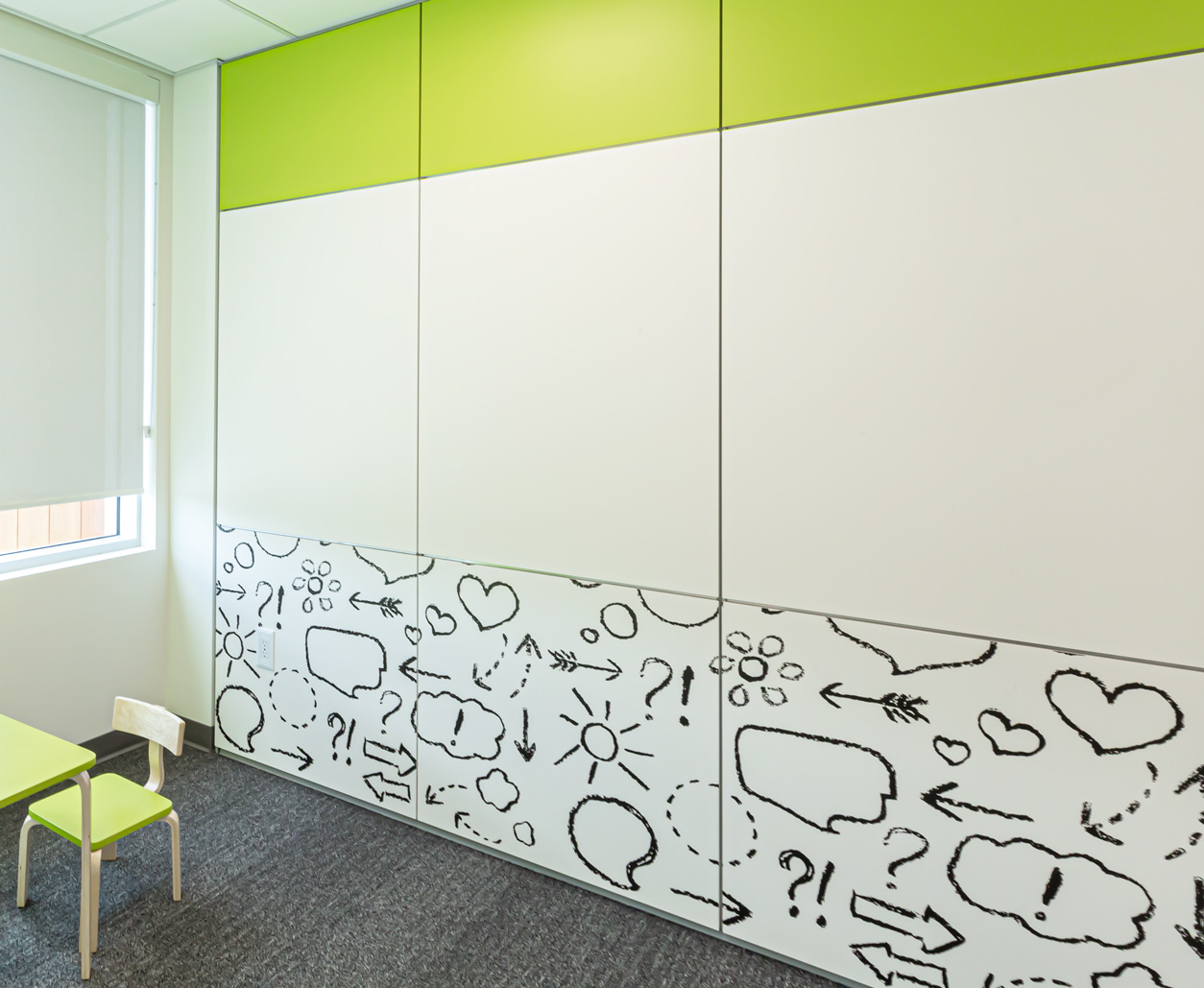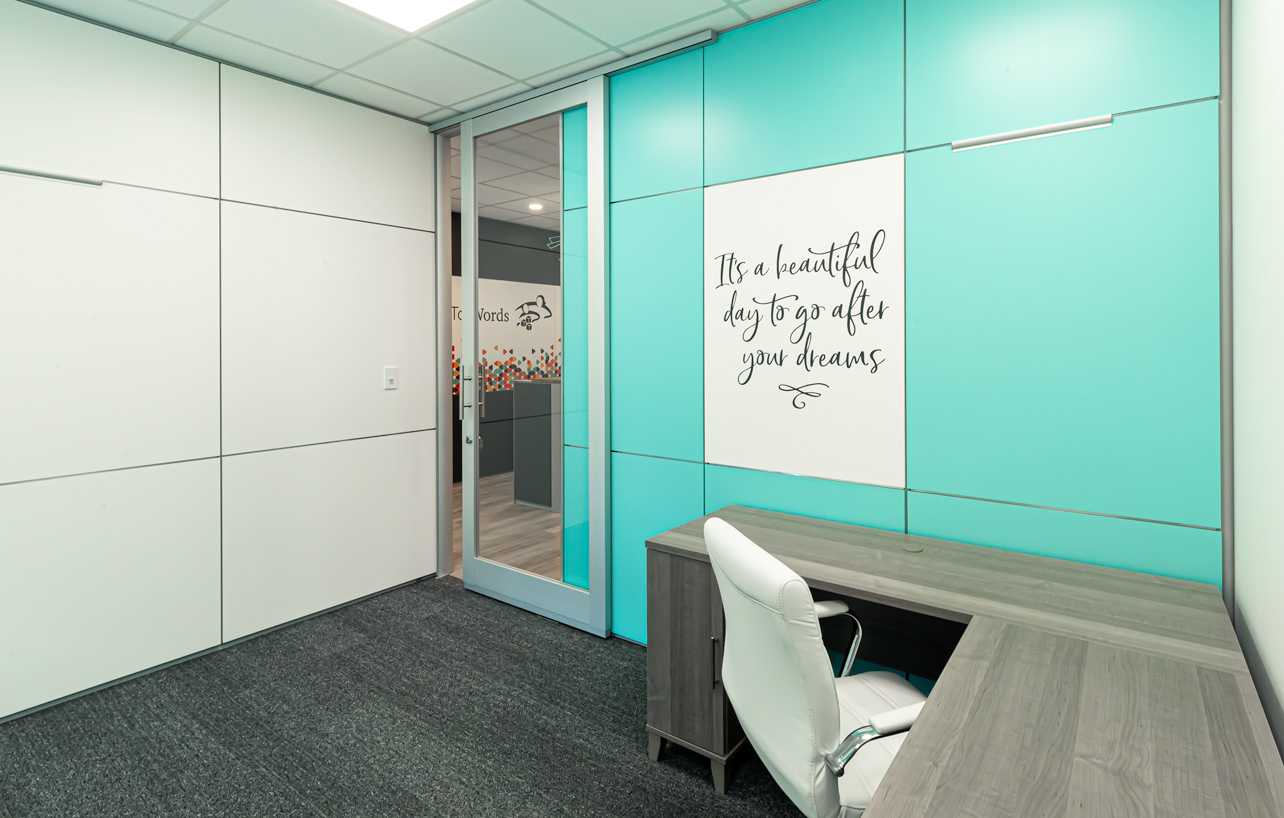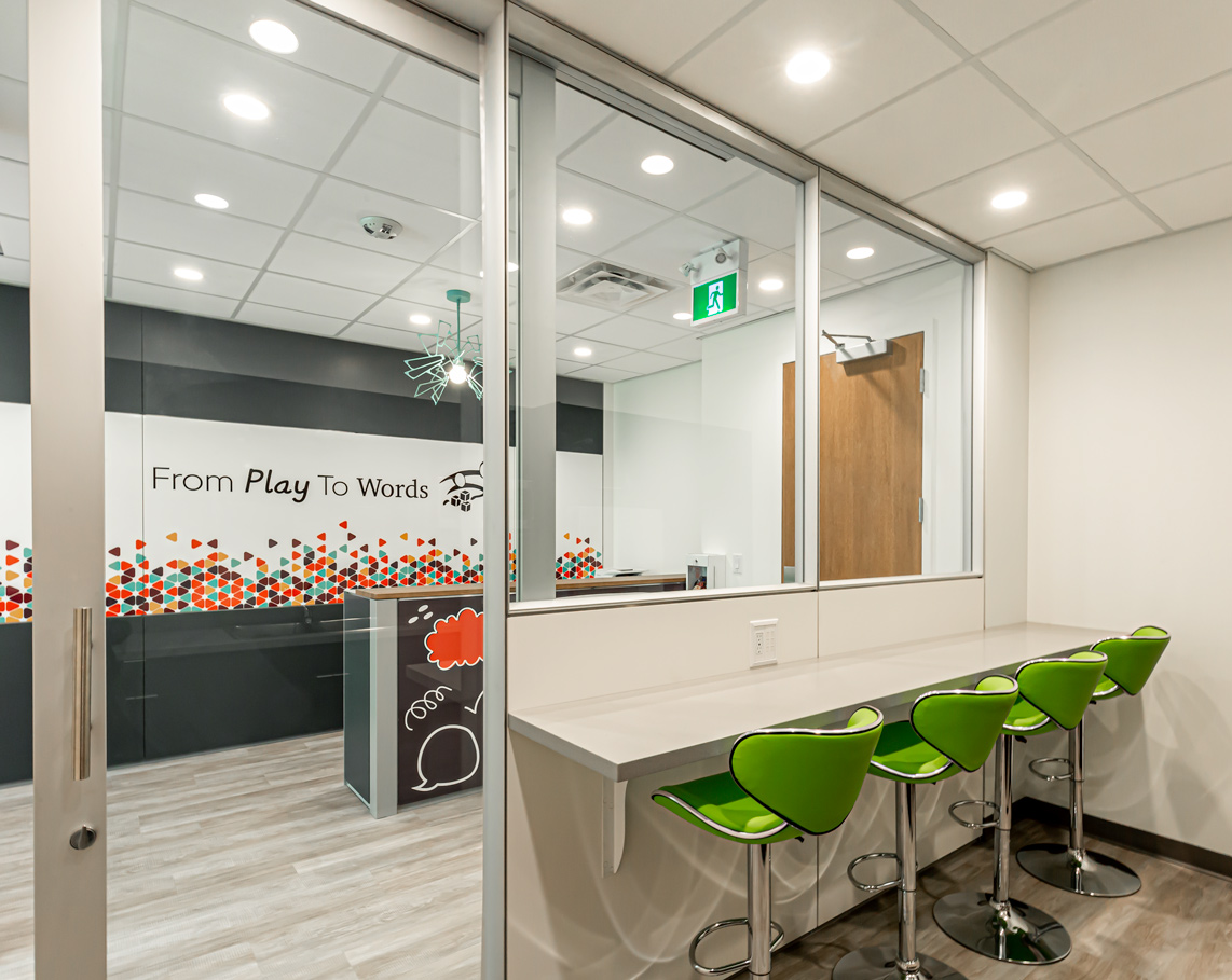 Our second location for this client, a unique child therapy services provider, this space featured glass fronts, solid walls, barn and wing doors, a DIRTT reception desk, and an array of custom graphic tiles and vibrant colours throughout.
